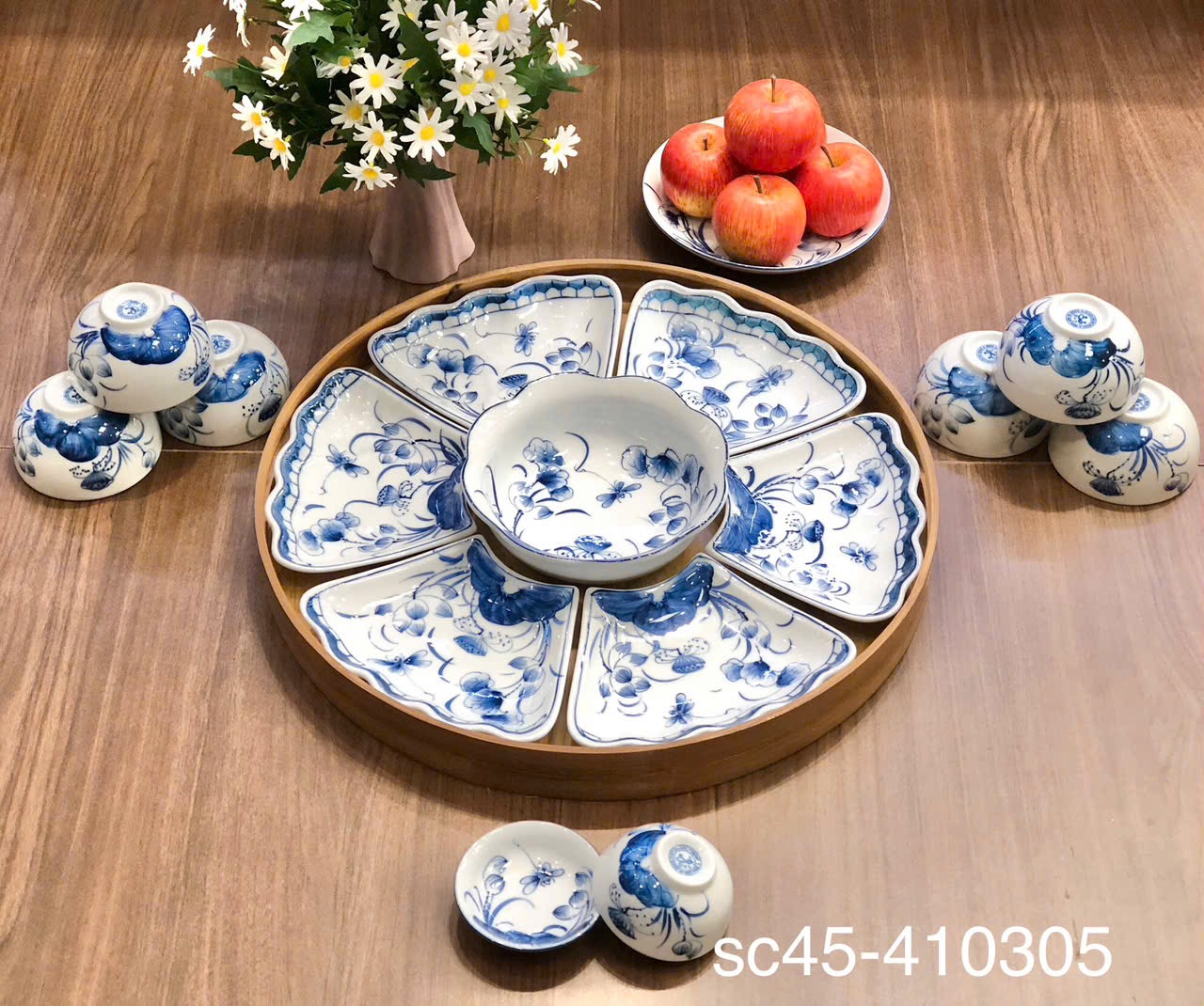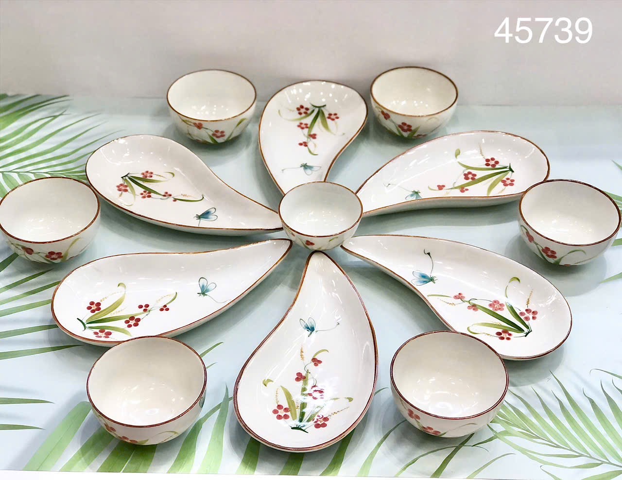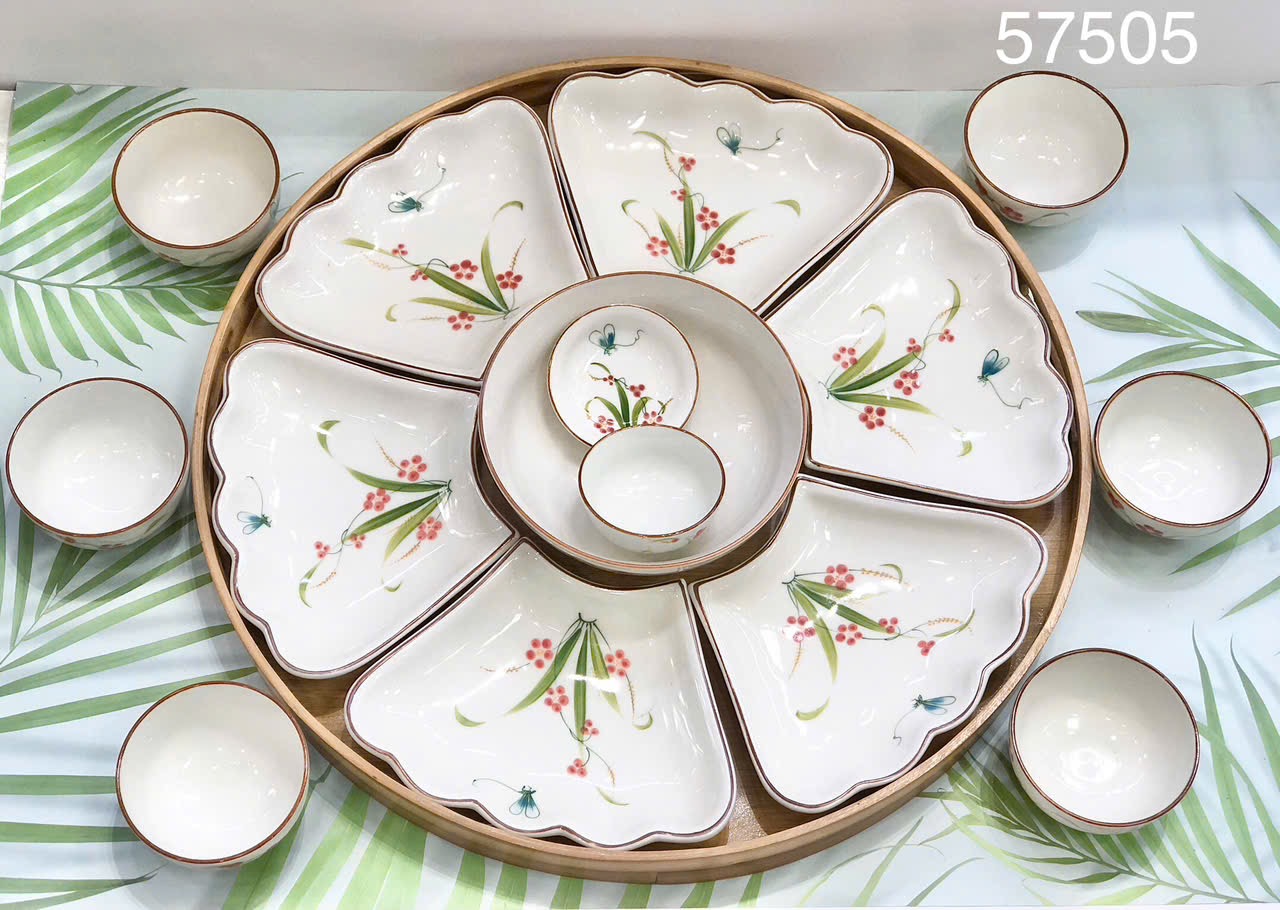 Xuân/Hè: Chọn bát đĩa men kem, vẽ hoa đào, hoa mai, hoặc lá ngò gai. Kết hợp với khăn trải bàn màu xanh nhạt.