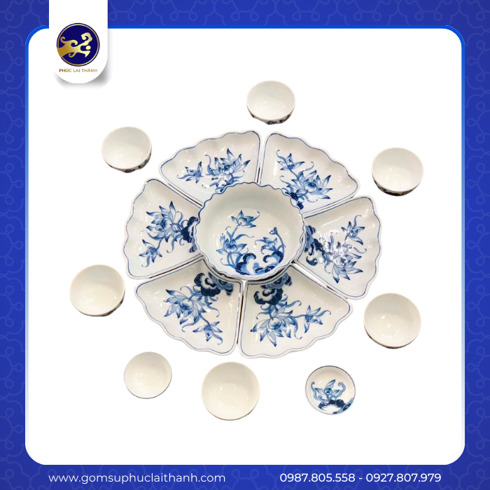 Sản phẩm sử dụng sứ Bát Tràng cao cấp, nung già lửa ở nhiệt độ cao, men sáng trong, bền màu, giữ được nét thanh khiết cần có trong không gian thờ. Các đường vân được thể hiện tiết chế, không cầu kỳ phô trương, phù hợp dùng trong các dịp cúng giỗ, lễ Tết, rằm – mùng một và những ngày trọng đại của gia đình.
