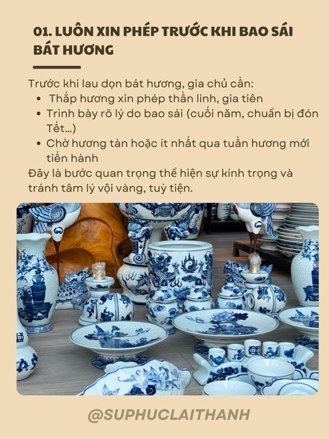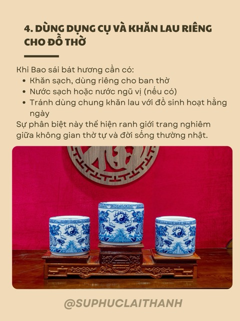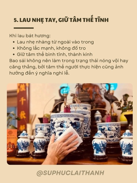 - Nếu bắt buộc phải nhấc bát hương để lau, cần nhấc nhẹ, đặt đúng vị trí cũ